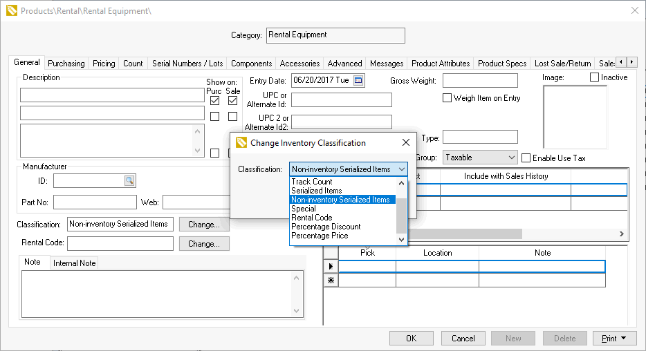 Click on the Change button to set the default Classification for the rental equipment folder as Non-inventory Serialized Items. Review the Entering Rental Equipment section for more details on classification options.