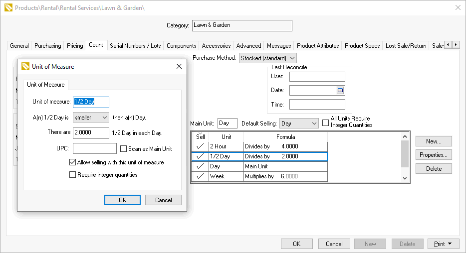 Enter Day into the Main Unit entry. Note that the Main Unit of measure entry must be set as day. Click on the New button and enter the standard unit of measure for each rental period option. The unit of measure options can be ignored within the default settings and entered into each item individually if the rental periods (unit of measure) vary greatly. The following examples may be applicable for rental service items: