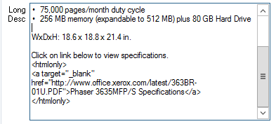For example, a link may be added to the long description by using the following HTML: <a href="http://www.eshcomputer.com"> Click on the link below to view product specifications. </a>