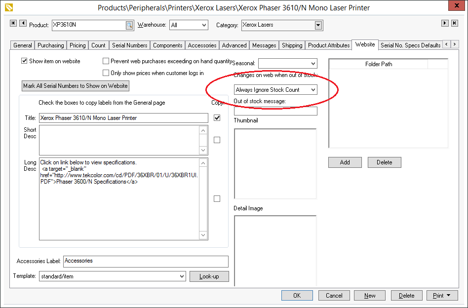 Inventory purchase can also be limited by a range of dates. The Seasonal setting is used to remove the Add to Cart button and replace it with a message. This option can be used to display items that are seasonal but only allow the user to purchase the products between two dates. This option can also be used to always restrict items from being sold on the ecommerce shopping cart. Review the Seasonal Items section for more details on this option.