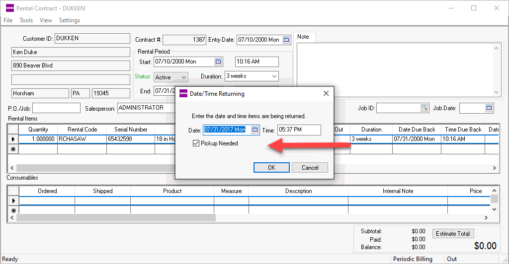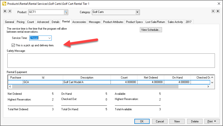 Items that normally require pickup and delivery should have the following This is a pick up and delivery item option enabled. Open a rental service code, click on the Rental tab, to enable the option.