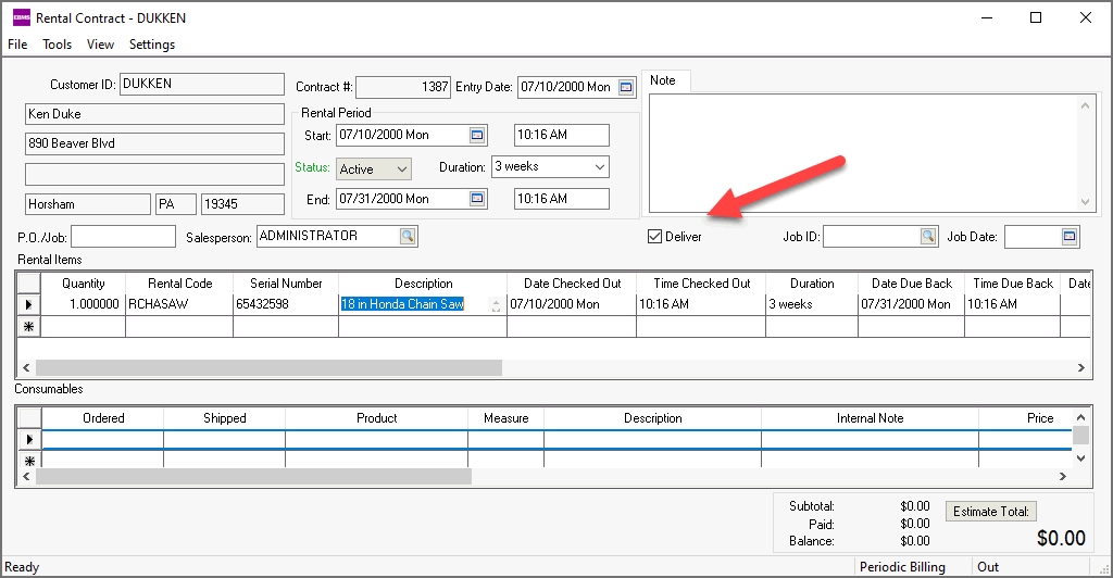 Enable the Deliver option on a rental contract to mark the rental items for delivery.