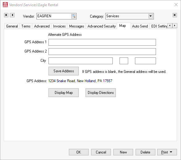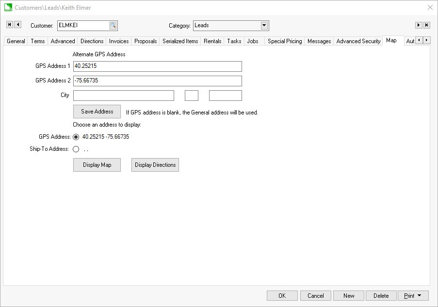 Keep the Alternate GPS Address lines blank to use the customer address recorded in the General tab.