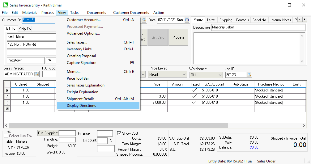 Directions can be displayed from the sales order by selecting from the sales order