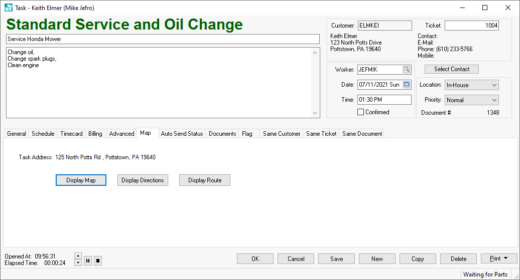 Click Display Map to open Google maps with the location highlighted. Click Display Directions to display directions between the company location and the customer's GPS address. Review [Main] Getting Started > Company Setup for steps to enter company address.