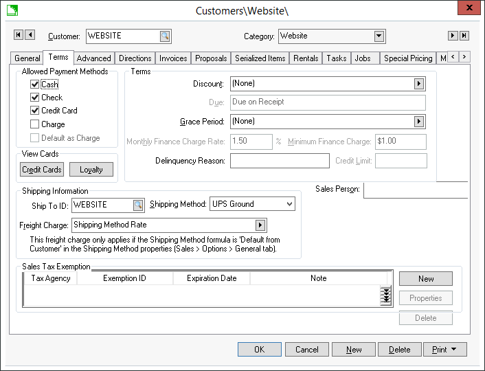 Open the customer record to set payment options. Customer records can be manually created within EBMS or may be created within the website if the Sales > Options > Website > Allow web user to create a new customer option is enabled. Review the Sales > Customers > Adding a New Customer section within the sales manual or the Configuring the Shopping Cart > Customer Accounts section for more details on creating customer records.