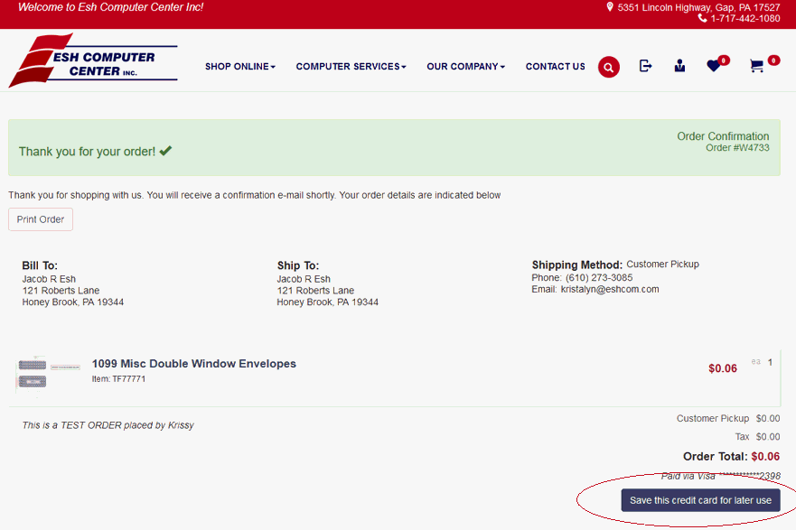 To store the credit card for future use, place the order and then click on the Save this credit card for later use button. The user must log in using a customer account for this option to be available.