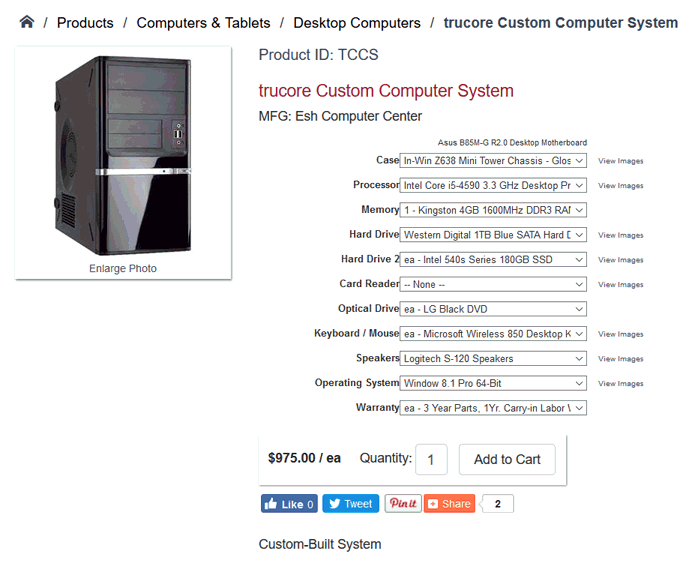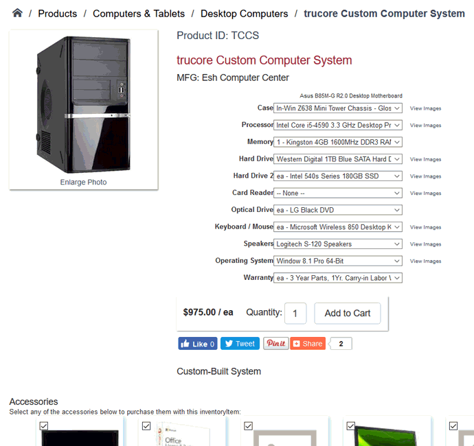 The optional component option within an e-commerce website is an excellent tool to allow the web customer to configure custom sets or made to order items. The optional component allows the customer to select custom options on the website when purchasing product. For example, in the following page a user can configure a custom built item by selecting optional components for the machine: