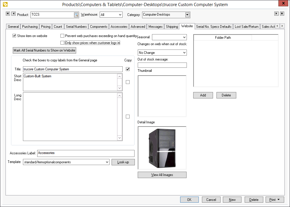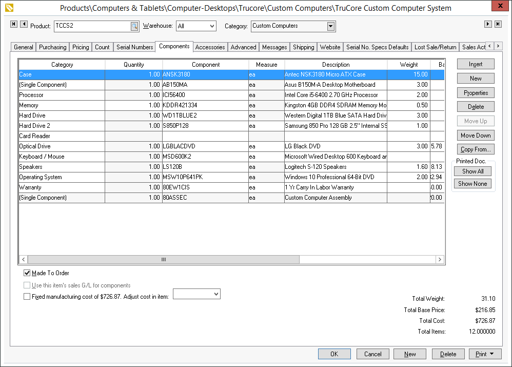 The Assembly Kit or Made to Order option must be enabled as shown above for the optional component template to be used within an item. Multiple sets of optional components can be added to a single SKU# and the price can react according to the selections made by the web user. Review the following sections for more details: