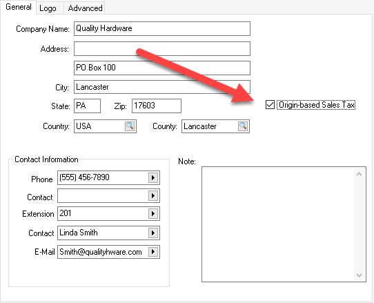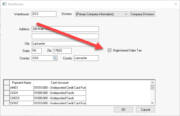 Enable the Origin-based Sales Tax option if the warehouse or sales location is within an origin-based state. Click OK to save.