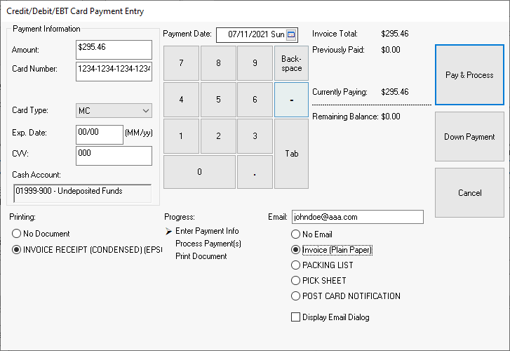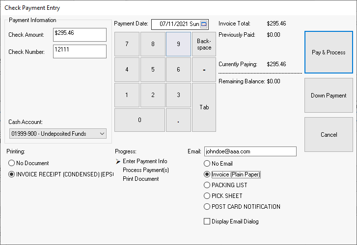 Click on the Pay & Process button to process the payment. If the Amount Applied does no equal the total of the invoice the Pay & Process button will be replaced with the Split Tender button. The Split Tender process is used to apply multiple payment types to the same invoice.