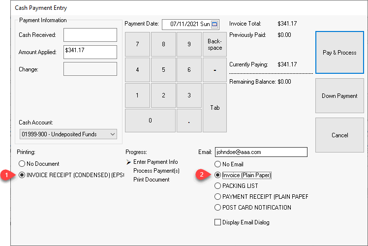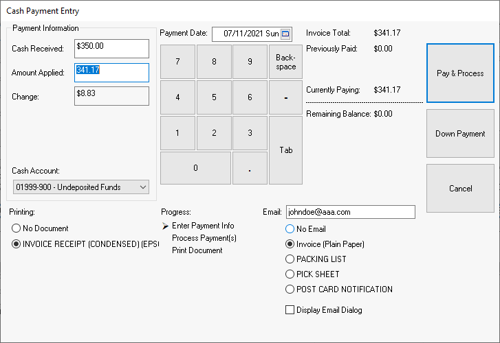 Enter the Cash Received to calculate the Change amount due to the customer. The Cash Received can be kept blank if no Change calculation is desired.