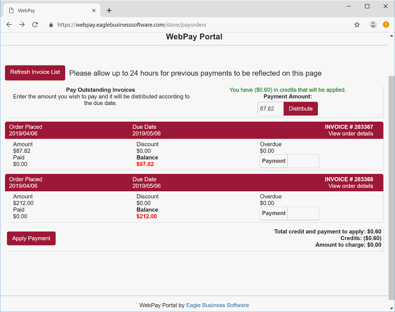 Credits will appear as a message on the top of the portal. These credits will be applied to any additional Payment Amount entered by the user. Enter the Payment Amount in the top right corner of the payment portal and click on the Distribute button to apply the payment to individual invoices from the oldest to the newest.