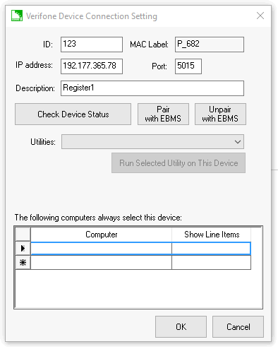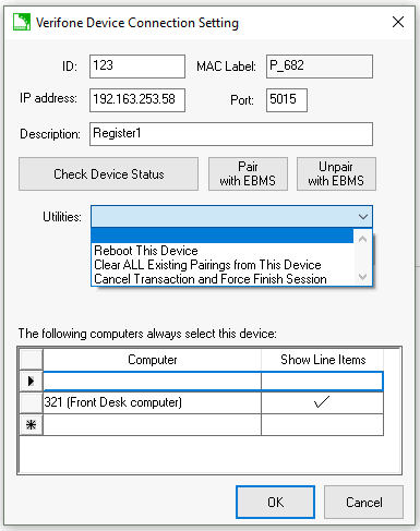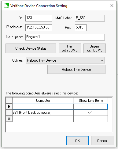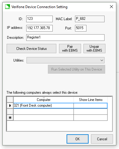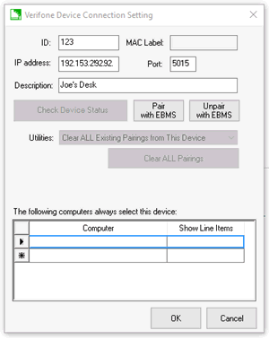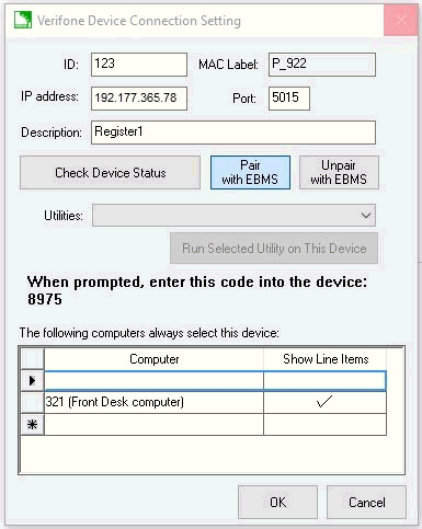 In the EBMS Verifone Device Connection Setting dialog still visible on the computer screen, click OK to save changes. Pairing with EBMS is now complete.