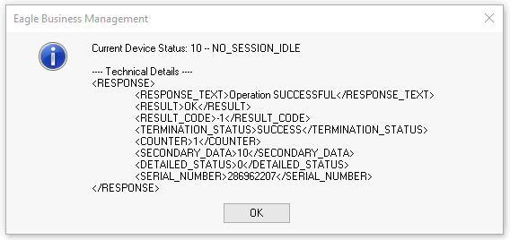 The Check Device Status button allows the user to check the current processes taking place on the Point device. This includes actions such as waiting for a signature, processing a payment, not responsive, transaction complete, as well as showing the idle screen when the device is available for use. An example of the dialog that will appear when clicking this button is shown below.