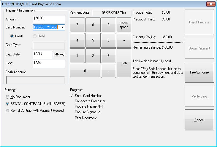 Complete the following steps to pre-authorize a credit card for a rental contract: