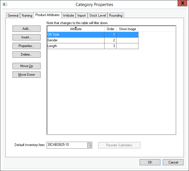 The Product Attributes tab of the folder identifies the attribute labels but does not define the options. Attribute options are set within the individual inventory items. All items within the folder should have common attributes. For example in the example shown above, all items within the selected folder include a Type, Connectors, and Length attributes.