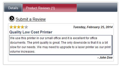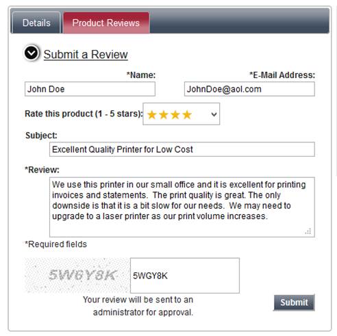 The product review optional module allows the customer to submit or read reviews about a product on the website. These reviews are approved by the administrator and then posted to the product page of the website.