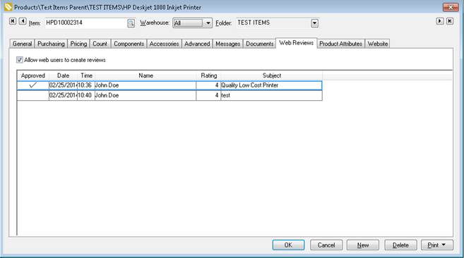 Product reviews are managed within the item. Open an item and select the Web Reviews tab as shown below: