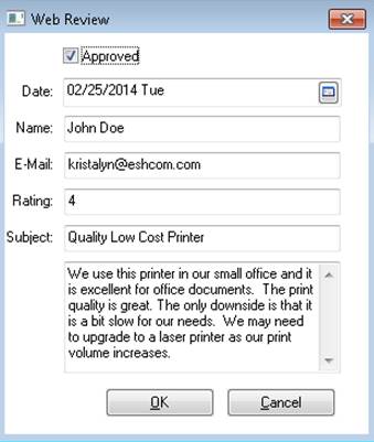 Double click on a review to open, approve, or remove any web review. De-selecting the Approve option on the review will remove it from the website. Reviews cannot be deleted or added from within the EBMS software.