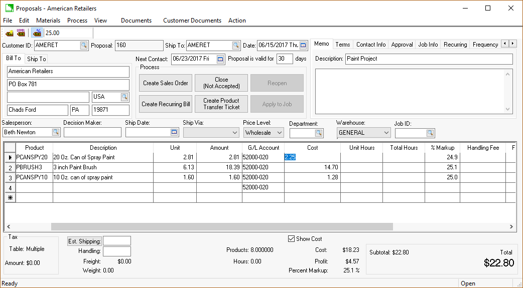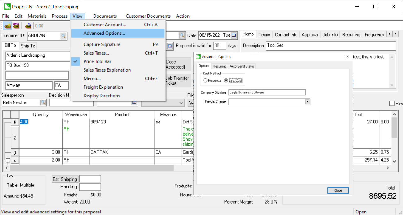 Proposals can be recalculated use either cost option. The Last Cost gives the salesperson the margin calculation based on the most current pricing. The Perpetual cost is based on the current cost based on FIFO inventory.