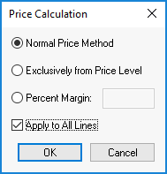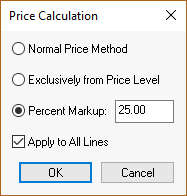 The pricing of each proposal line can be set to derive the price using the Normal Method, from the Price Level, Percent Markup, or Percent Margin. Set the price settings by selecting Edit > Price Calculation from the menu to open the following dialog: