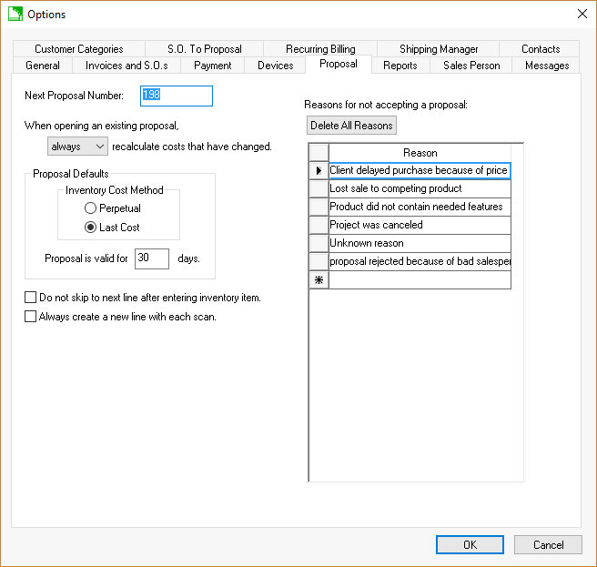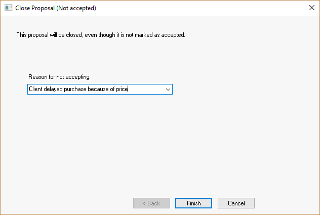 Select an optional Reason for not accepting since the proposal was rejected. This allows the user to analyze rejected proposals based on the reason. The user can manually enter a new reason into the entry field and this reason will be recorded within the reason list. Click the Finish button to complete the close process. The reason list is accessed from the main menu by clicking the as shown below: