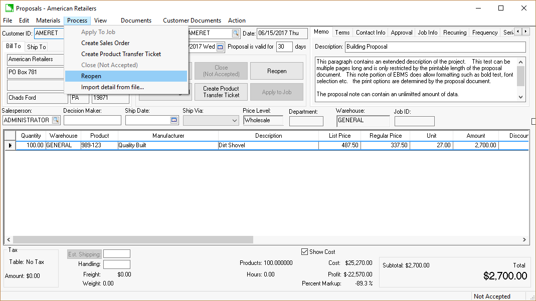 A proposal is set as Accepted when the Apply to Job (Job Costing only), Create Sales Order, or Create Inventory Transfer Ticket (Job Costing only) wizards are activated from the Process menu of the proposal. Review the Creating a Sales Order from a Proposal section for more details on the Create Sales Order option. Review the Use Proposals in Job Costing section for more details on the Apply to Job and the Create Inventory Transfer Ticket options.