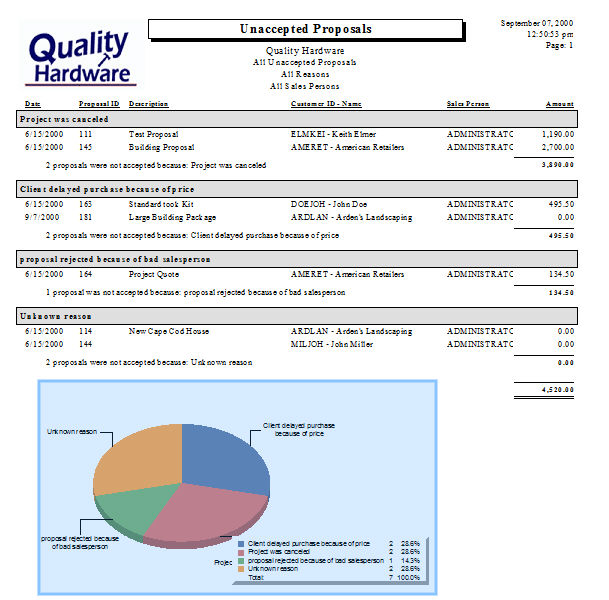 The proposal status is only used for reporting and management reasons since a proposal does not create any G/L transactions. Go to the folder and print the Unaccepted Proposal Report as shown below: