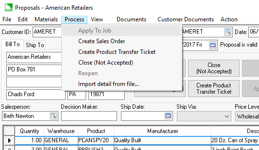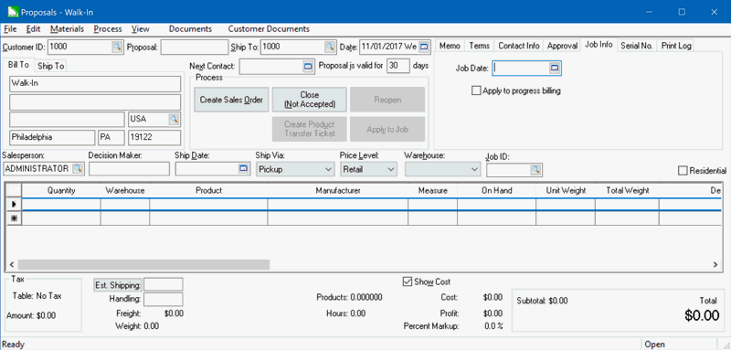 The proposal window is an integral part of the Job Costing module. The budgeted costs and income are recorded within the proposal window and applied to the job. Enter a Job ID into the proposal to apply a budget (proposal) to a job. Note that the Customer ID within the proposal must match the Customer ID within the job. Select Process > Apply to Job option from the proposal menu to apply the values to a job. Review [Financials] Job Cost > Jobs > Entering a New Proposal or Job Budget for more details.
