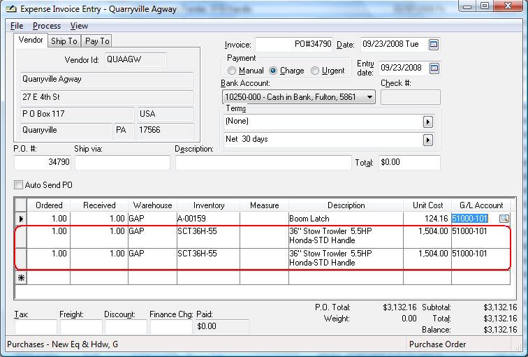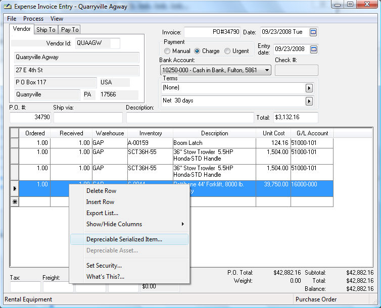 The 2nd and 3rd lines of the purchase order shown above contain the new rental items. Each rental item that is depreciated must be entered into separate purchase order lines. A depreciable rental asset cannot have a quantity of more than one. Notice that the information is entered into the PO using similar steps as other inventory items, with the exception of the G/L Account. The G/L Account for the rental item is a depreciable asset account since the rental item will be depreciated.