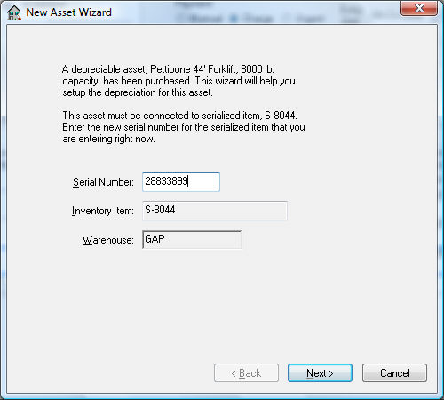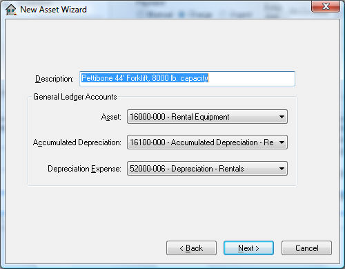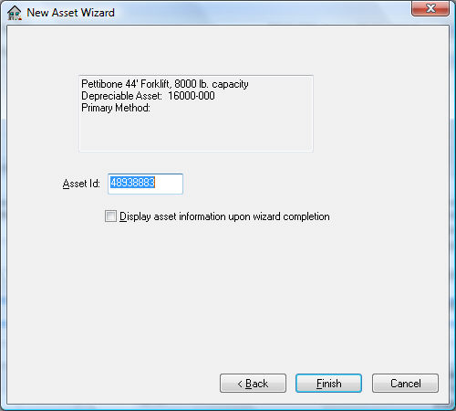 Enter the Asset ID. Display asset information upon wizard completion will open the Depreciable Asset window.