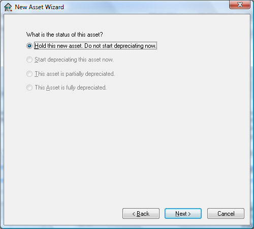 Hold this new asset. Do not start depreciating now. This option is the only available option if no depreciating method has been entered for this asset. The Hold option will record the asset but will not process any accumulating depreciation and is useful if the user wishes to obtain advice on the appropriate depreciation method. The asset status can be changed to a depreciating status at any time.