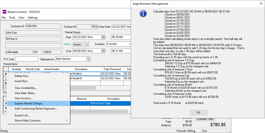 RIght click on any of the rental contract's detail lines and select Explain Rental Charge from the context menu.