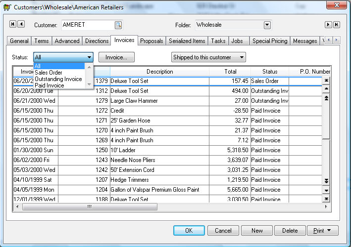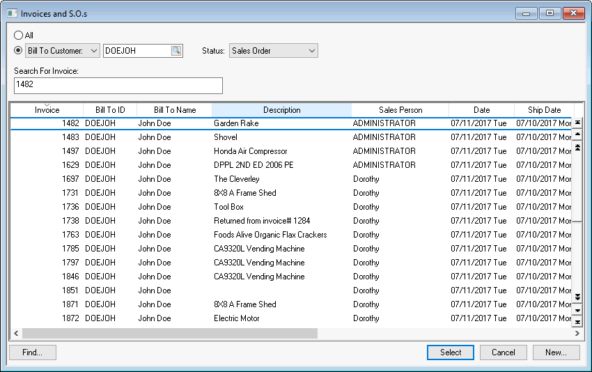 To display sales orders for a specific customer, set the Bill To Customer or Ship To Customer option button and set the Status field to Sales Orders. To view all sales orders, set the All option, rather than Customer. Use the query feature to find a specific sales order based on other sales order criteria.