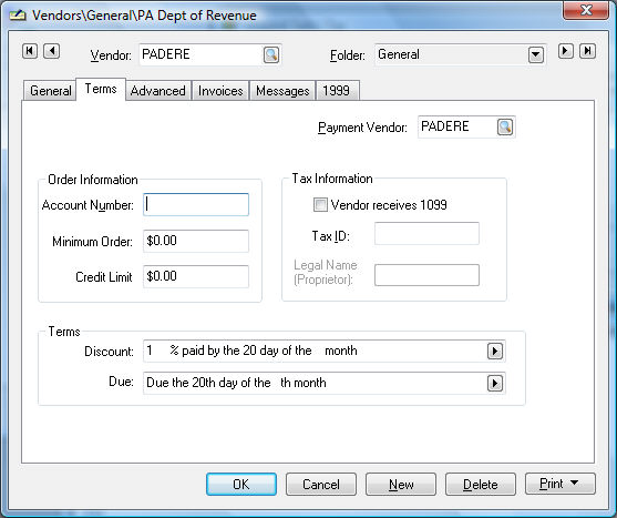 Set the discount terms to the proper percentage if the tax agency gives the tax collector a percentage for the collection costs. The Discount and Due settings shown above are the appropriate settings if the state gives a 1% discount and the payment due date is the 20th of the month.