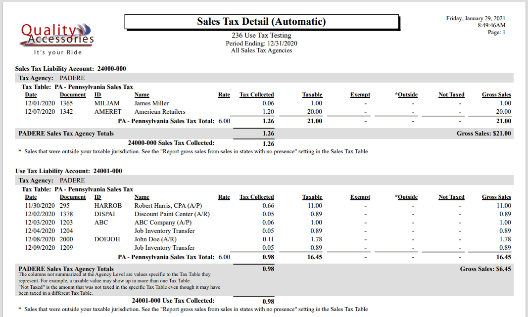 Click Print to print the Sales Tax Detail report. Review the report documentation section below for details.