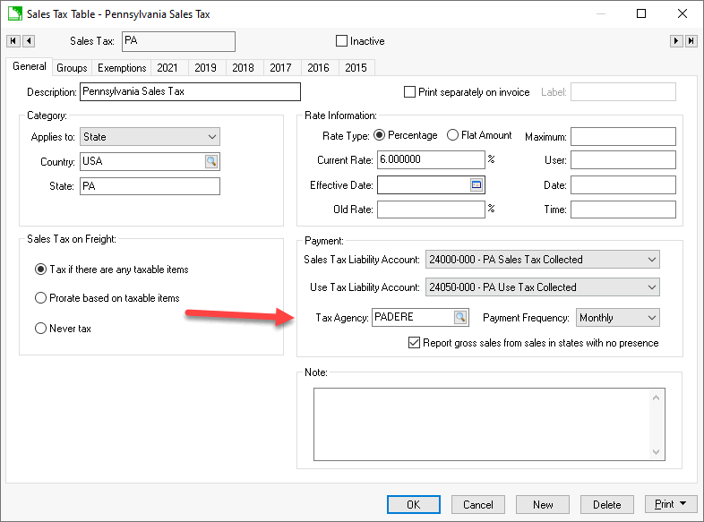 Reports can be printed to list the transaction detail by selecting the appropriate report from the Print button located on the tax rate dialog. Review [Main] Reports > Print Button for instructions to add specific sales tax reports to the Print button.