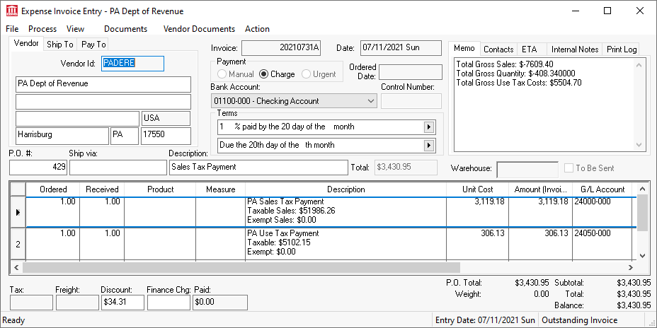 EBMS includes a step by step payment wizard to pay sales tax that has been collected from customers and use tax for consumed items. The tools included with EBMS are convenient ways to calculate the tax payable, the taxable totals, and the gross total required by most state tax agencies.