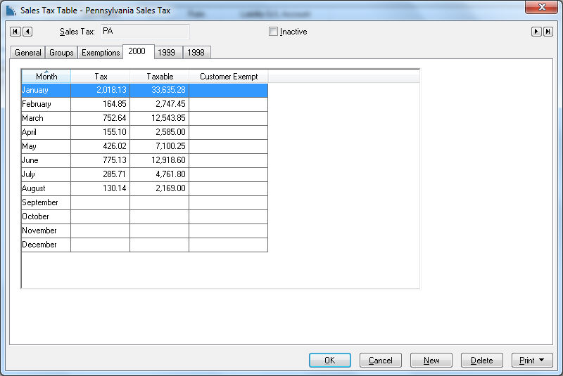 The Tax column identifies the total amount of tax collected for each period and the Taxable amount identifies the total that was taxable. The Customer Exempt column shows the total amount of sales that were sold to customers that were sales tax exempt. This column does not include items that are non-taxable. Use sales tax reports found in to review tax details.