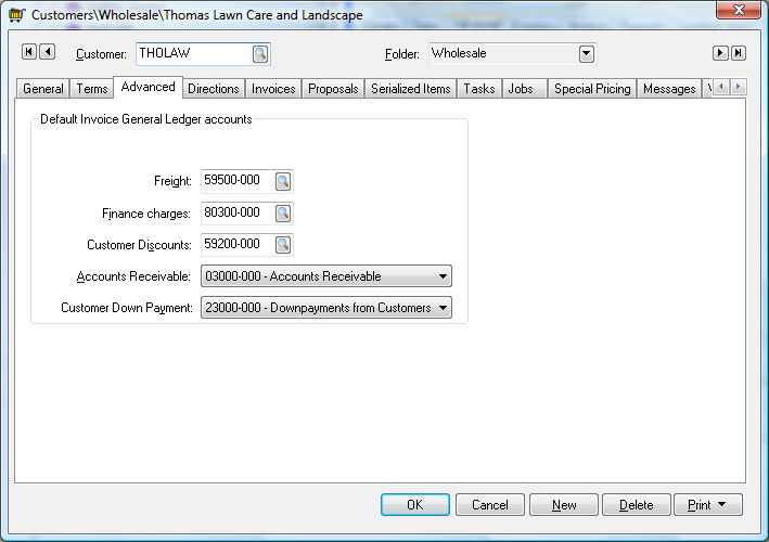 This is where the customer's general ledger account defaults are set up and modified. These accounts are universally set in most situations. To universally set up the advanced tab settings, go to Sales Menu > Options > Customer Categories tab > Edit Defaults button > Advanced tab. Review the Setting Customer Defaults section for details in globally changing the advanced tab general ledger accounts.