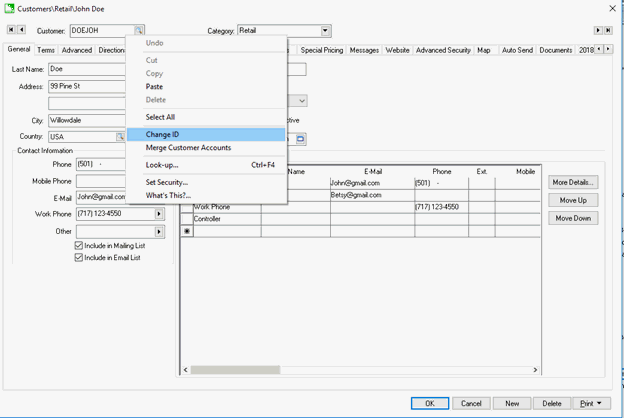 Right click on the Customer field with your mouse to open the context menu and change the customer's identification code. Selecting Change ID, which will start a lengthy process of changing this customer's code throughout the system. It is possible to load a different customer by clicking on the lookup button to the right of the Customer entry field and selecting a new customer.