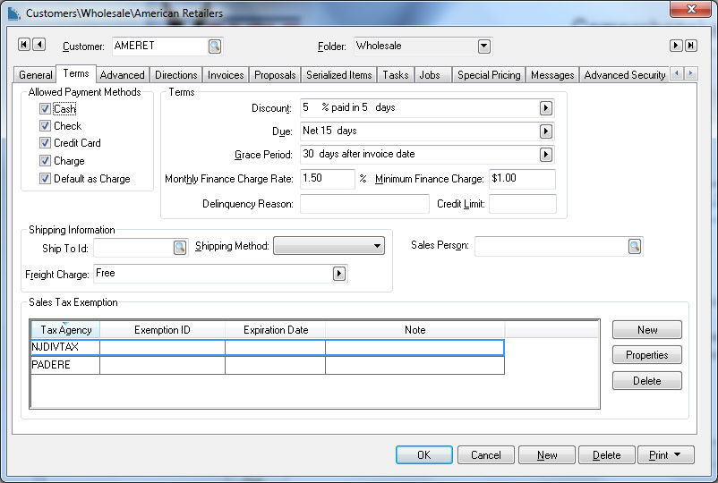 The Sales Tax Exemption settings should be set if the customer is sales tax exempt. See the Sales Tax section for more details on sales tax processing.