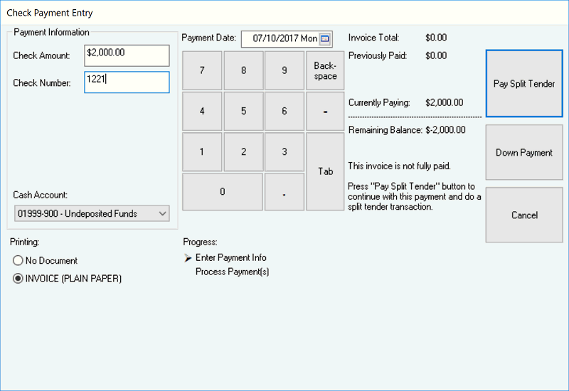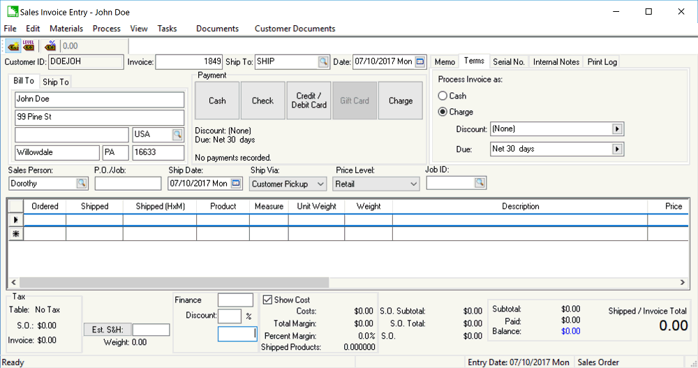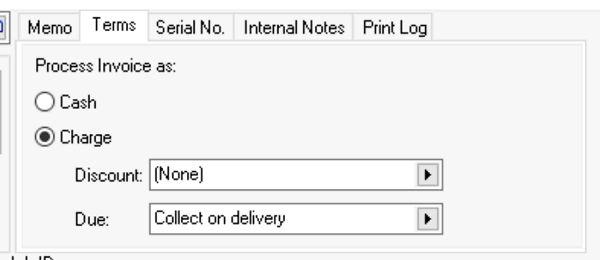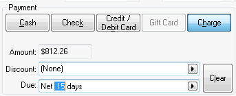 The Payment options found on a sales order or invoice are used to set the terms or process any payment. The only Payment terms options without processing a payment is Cash or Charge. Down payments or cash payments can be processed using a variety of payment options such as Cash, Check, Credit / Debit Card, or Gift Card.