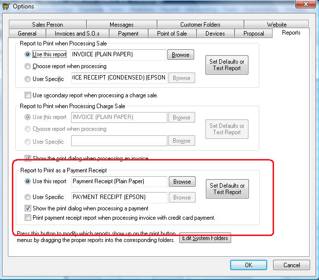 Go to Sales > Options and click on the Reports tab to set the payment receipt report.