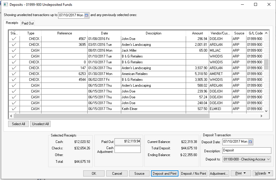 or customer payments using the selected cash account. Select all the