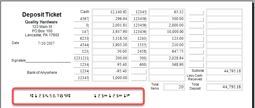 The Bank Deposit Slip is set with the