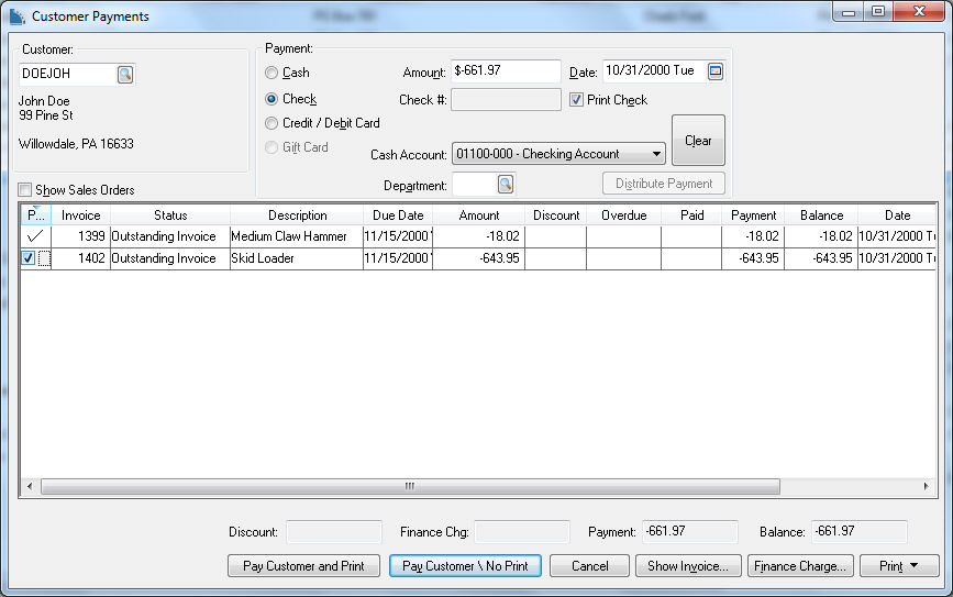 Enable the Print Check to print a refund check for the customers credit and set the Cash Account to the bank account that you wish to use to refund the credit. Using the following step if a payment other than a check is used: