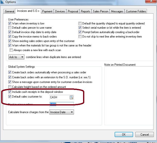 A Miscellaneous Customer may also be created in a point-of-sale environment where customer information is not entered for individual sales orders. For example a generic customer may be created for all sales recorded on POS station 1. Enter the Miscellaneous customer ID into the Sales > Options as shown below so that the sales invoice defaults to the Miscellaneous customer each time the invoice is opened.