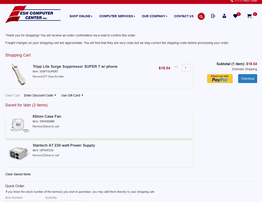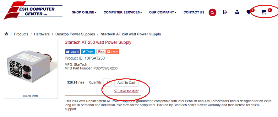 A website customer may choose to save an item to purchase at a later date. Click Save for Later from any item page or from the cart page.